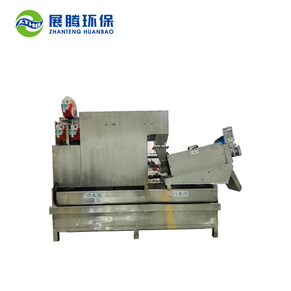 待处理循环污水抽入预处理槽,后进入加速反应器,同时自动添加搅拌好的药剂,在加速反应器反应完成进入气浮槽,污水迅速形成上浮的矾花,水迅速变清。絮凝好的矾花被刮渣器刮入叠螺机滤筒,受到螺旋轴旋片的推送而向卸料口移动,移动过程旋片越旋越紧,挤压脱水,脱水后的泥渣从卸料口自动被排出来。清水经过管路自动回到水池。经过多次循环,可以把水中的油漆全部分离出来。同时漆渣被挤压脱水后重量大大减少,方便处理。